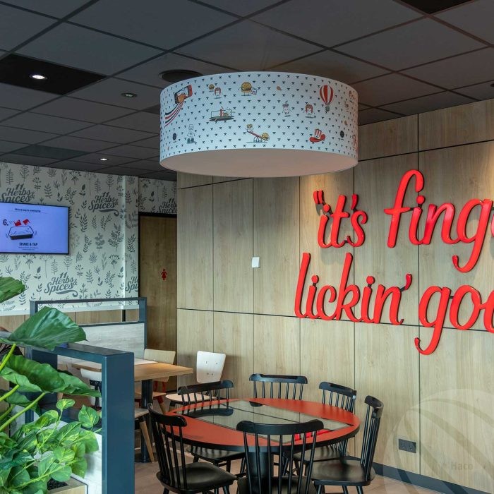 Bij KFC bracht Haco ook alle instore signing aan. Met verlichte letters tegen binnenwanden, wayfinding in de vorm van bordjes en bestickering en grote teksten uitgevoerd in muurfolie werd de complete KFC stijl binnen doorgevoerd.