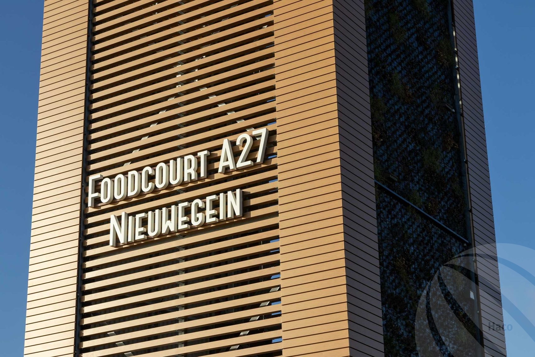 De geveldelen van de verschillende ketens werden met gevelbeplating in de juiste huisstijlkleur gebracht. Daarop monteerde Haco de verschillende logo’s in verlichte doosletters in profiel HLD-5. In de toren monteerde Haco de verlichte logo’s van McDonald’s, KFC, e.a. De grote McDonald’s “M” werd door Haco in delen naar de locatie gebracht en op het parkeerterrein afgemonteerd. Omdat de toren slechts aan één zijde bereikbaar was, werd gebruik gemaakt van een 50m. hoge torenkraan, waarmee alle logo’s